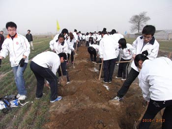 一到目的地,志愿者们就马上投入到紧张的植树活动中。大家信心十足,忙得乐此不疲,也顾不上泥土沾衣,个个精神抖擞,或孤军奋战,或多人联手,一齐挥着铁锹,在热火朝天的忙碌中,不多时一棵棵树苗站立了起来,活动现场时时传来欢乐的笑声。经过两个多小时的努力,百余棵树苗植入春天的大地,整齐的排列在了道路的两旁,志愿者们以实际行动表明了自己建设绿色家园的真心真情,也用劳动和汗水为城市增添了一抹新绿。