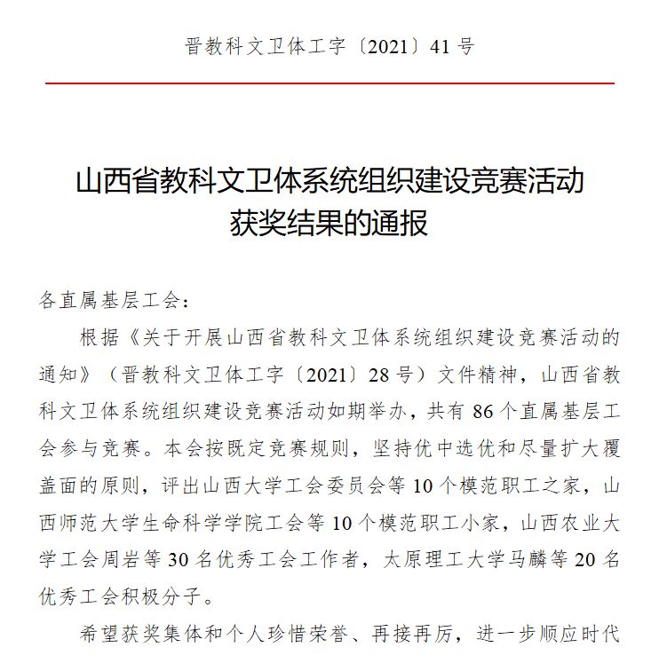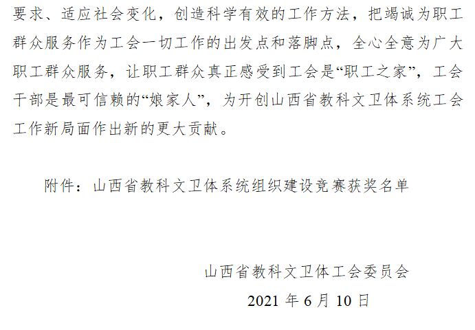 近日,山西省教科文卫下发关于《山西省教科文卫体系统组织建设竞赛活动获奖结果的通报》,B体育BSport工会荣获山西省教科文卫体系统“模范职工小家”荣誉称号。