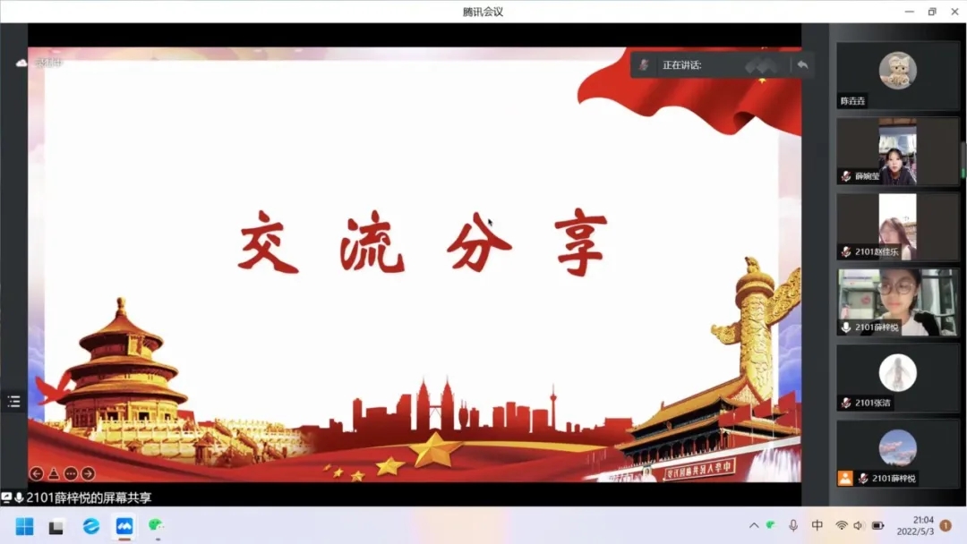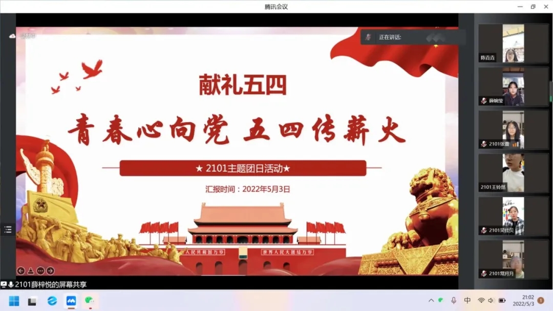 2101团支部由主持人带领同学们回顾五四运动激荡历史、观看百年党史视频,重温百余年前那段激情燃烧的岁月。同学们用铿锵有力的朗诵声向先烈致敬,为五四运动献礼,激励自己在新征程上继续昂扬奋进。