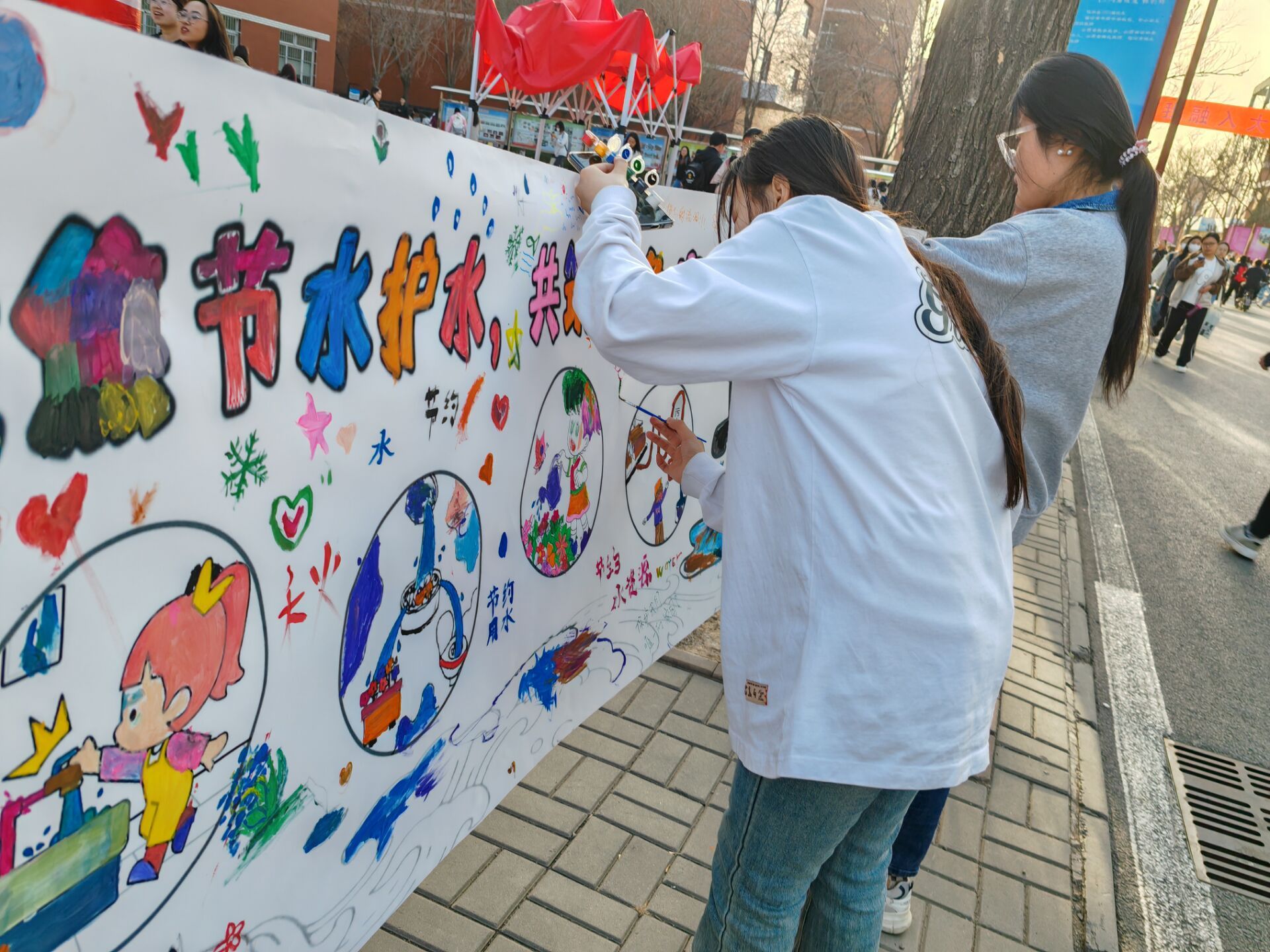 共绘节水画幅、书写节水誓言、抢答节水知识……一系列活动妙趣横生,吸引了众多同学前来参与。轻松愉悦的氛围里,大家或用颜料在横幅上描绘与水相关的图画,或在印有节水宣言的横幅上签下了自己的名字,以此表达节水护水的决心。围绕地球上水的占比、水资源枯竭的原因及节水措施等内容开展的知识问答环节里,同学们积极抢答,踊跃回答,现场气氛热烈而活跃。线上活动进一步丰富了活动内容,同学们不仅通过视频记录自己一天的节水用水情况,抒发自己的节水感悟,还集思广益想出许多新奇的节约用水宣传标语,这些标语由志愿者张贴在水龙头等用水处周围,在学校里营造了良好的节水氛围。还有同学创造出节水器具或净水装置,并录制了视频讲解模型的原理、优势和使用方法,同时记录了净水效果,为保护水资源贡献了自己的创新智慧。